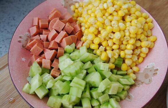 1、玉米粒解冻清洗干净,黄瓜去皮洗净切丁,火腿肠去皮切丁,葱姜切碎。