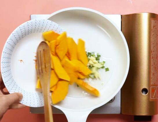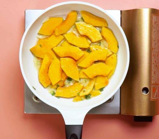 2、锅中倒油,倒入葱花,姜片,南瓜,翻炒均匀。