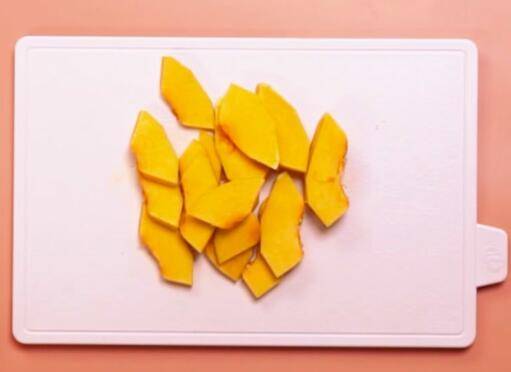 1、葱花,姜片,南瓜去籽去皮切片。