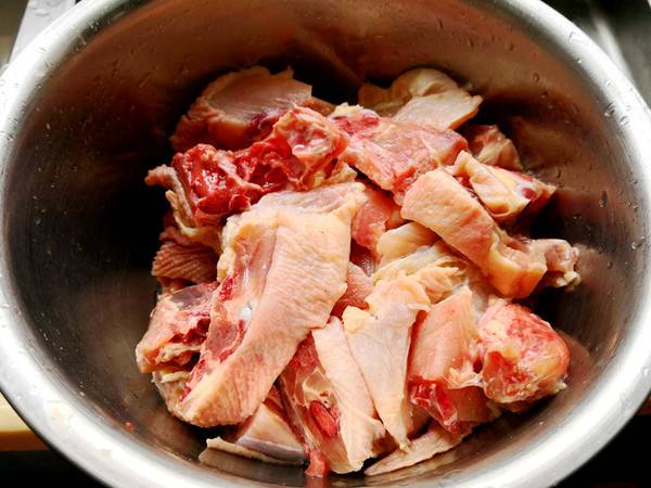 3、捞出鸡块过凉水,清洗干净,沥干水分。