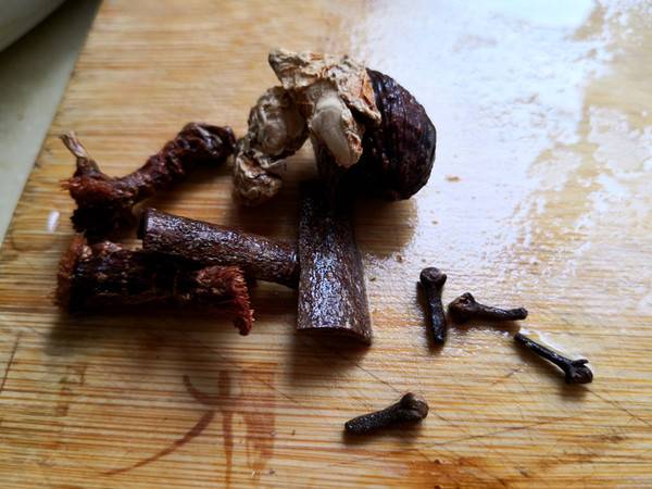 1、准备材料:小公鸡1只、桂皮2块、丁香4粒、凉姜少许、白芷少许、肉扣1个、料酒适量、花椒数粒、八角少许、大葱1根、姜片少许、老抽1勺、辣椒3个、盐少许。