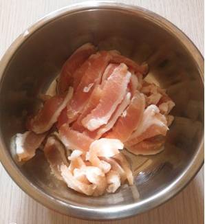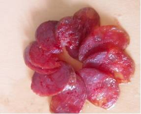 1、准备材料:自制秘制辣椒酱1勺、贵阳酸粉一小碗、板筋2两、莲花白四片、香肠一小截。