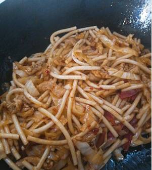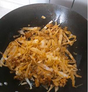 6、加莲花白,炒断生。加秘制辣椒酱、生抽、糖、香油、花椒油、泡水后的酸粉炒制。