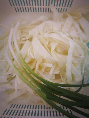 2、小葱、莲花白洗净,莲花白切丝,小葱切断。