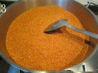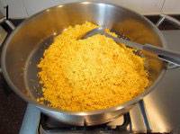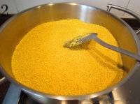 4、炒到小米变成焦褐色,其中部分小米还爆开了花,关火。关火后继续翻炒,炒到小米慢慢变温、变凉即可。