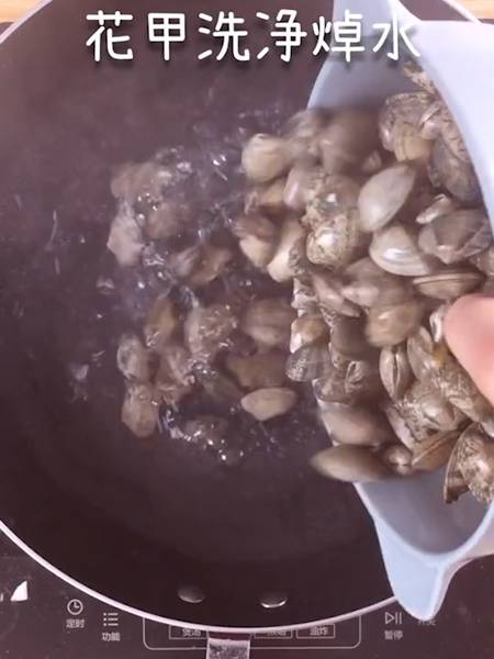2、花甲洗净焯水。