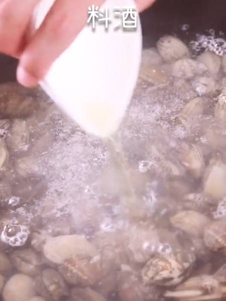 3、倒入料酒,煮至开口。