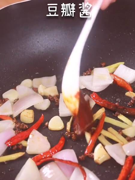5、倒入豆瓣酱,翻炒均匀。