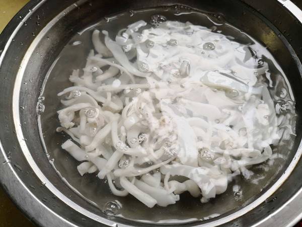 7、锅里加入适量的清水,水开后,锅里加入一点盐,再把墨鱼片放入其中,大约30秒左右取出来。
