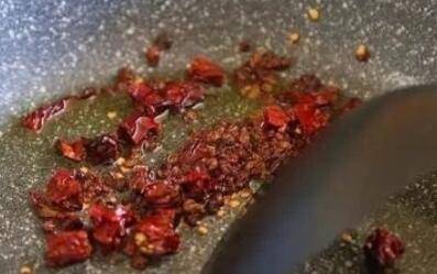 2、锅中倒油烧热,下入花椒和干辣椒炝锅,随后下入切好的虾米干翻炒。