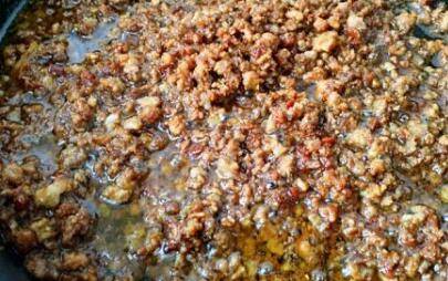 4、然后将肉泥和豆瓣酱,混炒均匀。