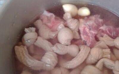 1、将猪小肠放沸水中煮10分钟,水里加花椒,姜片。