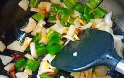 3、锅内倒入油烧热,放蒜蓉、切好的青椒、洋葱爆香。
