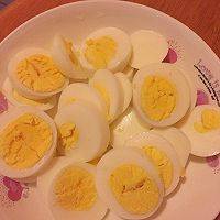 2、熟鸡蛋切成片,一个鸡蛋大概切成四五片。