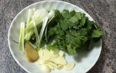 2、葱段、蒜瓣、姜片、大料备用,香菜备用。