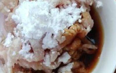 3、焯四季豆时,把肉丝放料酒,生姜,盐,糖,生粉,腌制15分钟。