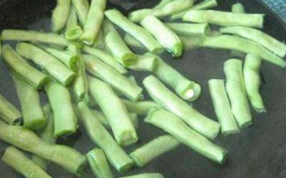 1、锅里烧开水后放入盐,倒入四季豆过水焯熟。