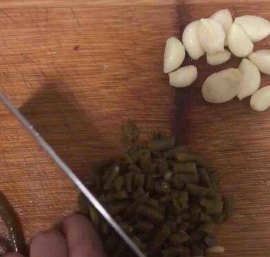 准备材料:酸豇豆一把、肉丝适量、蒜头一整个、辣椒干五六个、生抽适量、鸡精适量。