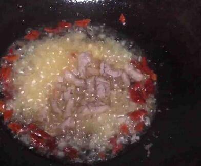 3、锅中入油,放入蒜蓉辣椒肉丝炒香。