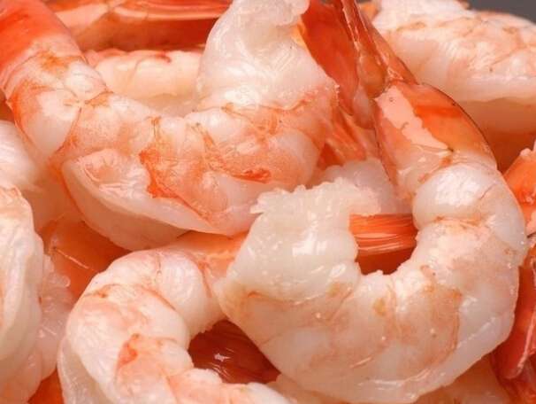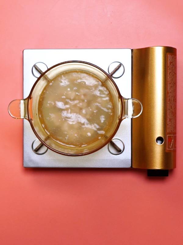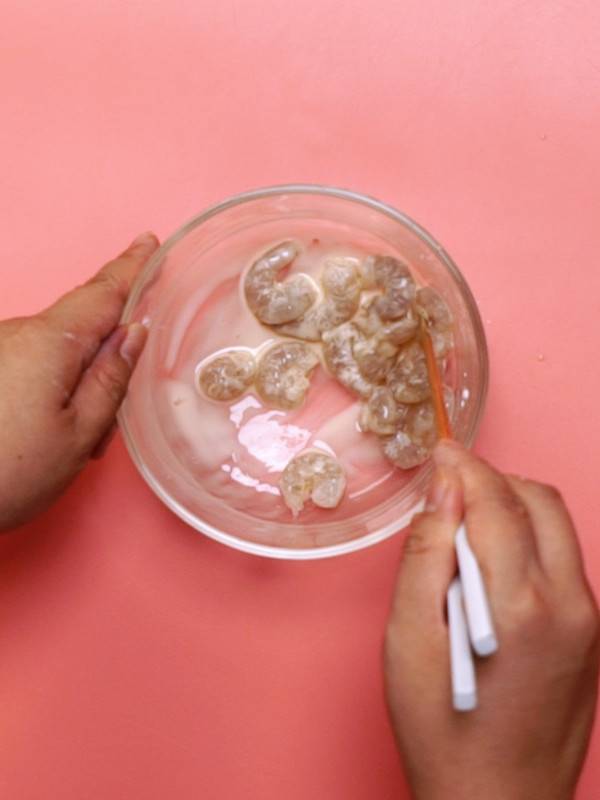 4、清水煮沸,倒入虾仁,焯水30秒。
