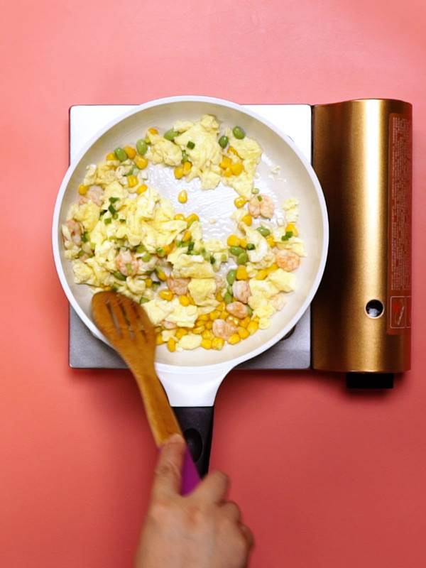 7、倒入虾仁、玉米粒、青豆、盐,小火翻炒均匀。