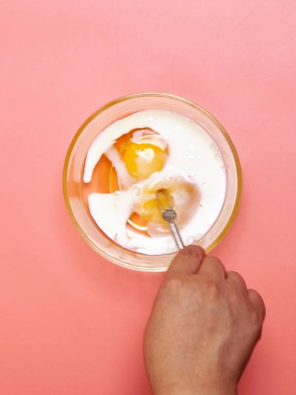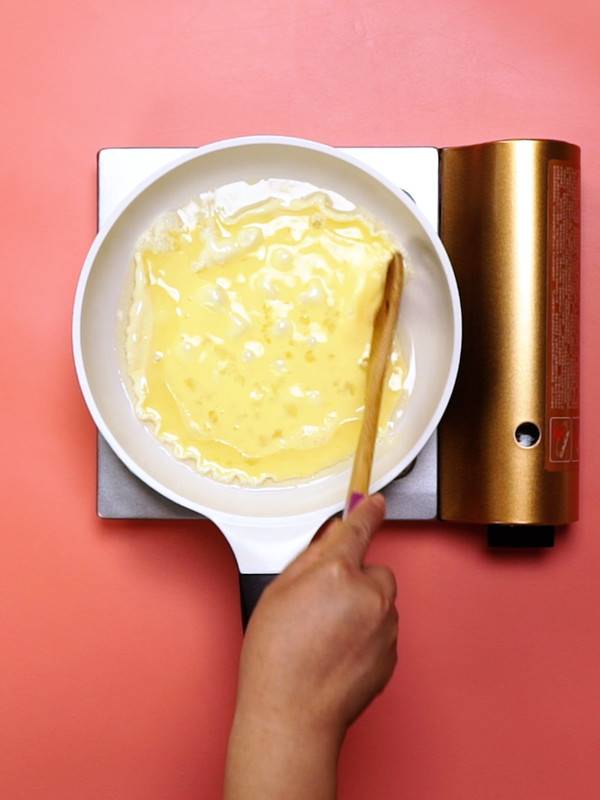 6、锅中倒油,倒入蛋液,小火炒熟。