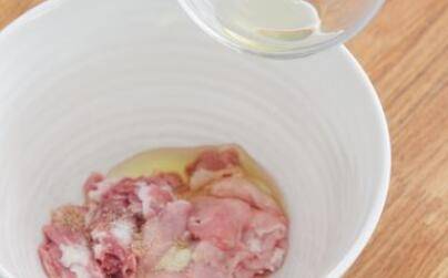 3、用白胡椒粉、料酒、一点盐、老抽、几滴油腌肉片十分钟(加点油腌肉,炒好的肉更嫩)。