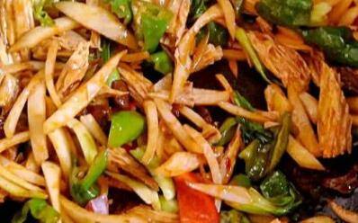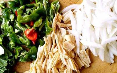 材料:高筋面粉适量、牛肉切片少量、腐竹少量、青红辣椒少量、青菜叶少量、大蒜适量。