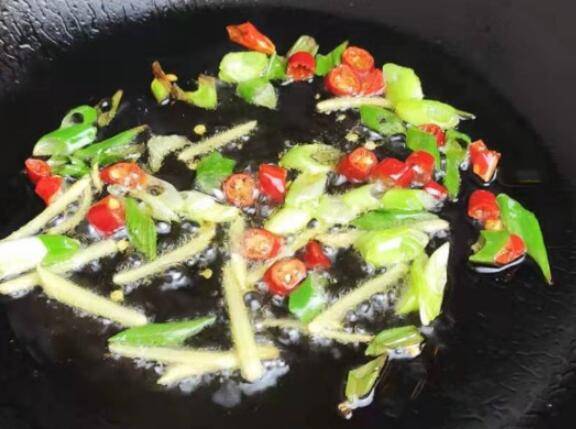 3、起锅烧油,油温五成热时倒入葱花、小米椒和姜丝炒出香味。(这时油温不能太热,如果太热的话葱花和姜丝刚放进去就被炸焦了,时间不够,香味激发的不够彻底)