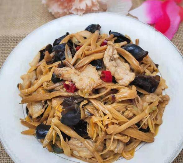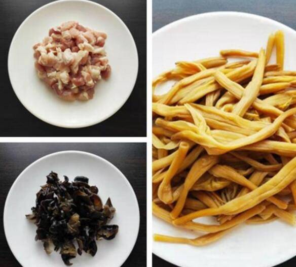 1、五花肉,切成片备用,木耳提前用水泡发撕成小朵,干黄花菜提前2小时泡发备用。