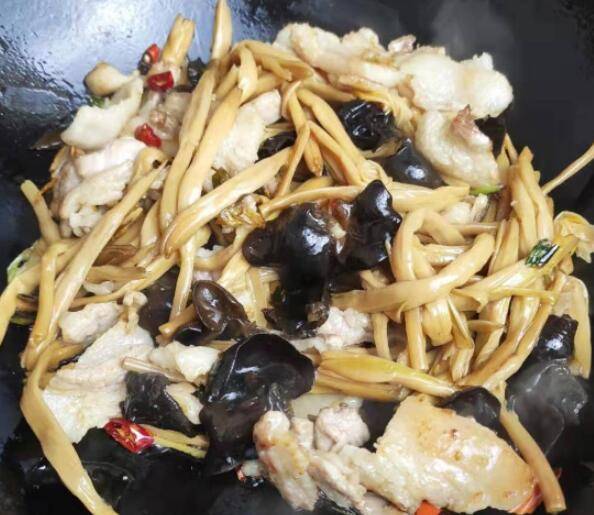 5、放入泡发好的黄花菜和木耳,翻炒片刻,使之均匀。(黄花菜下锅之前,稍微用手抓一下水分)