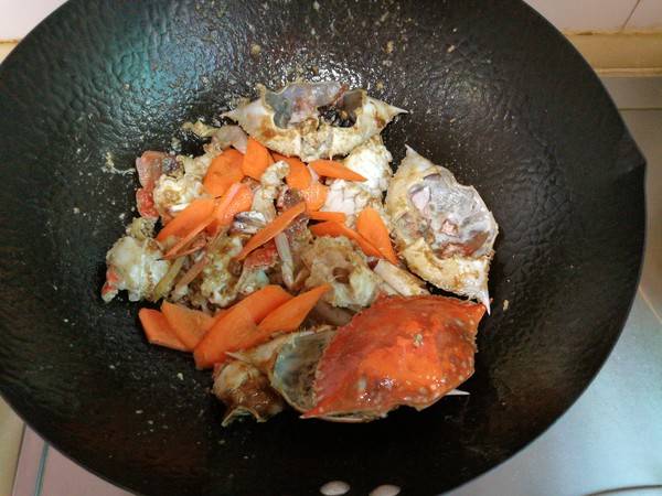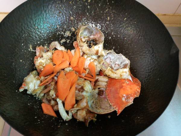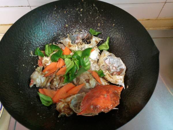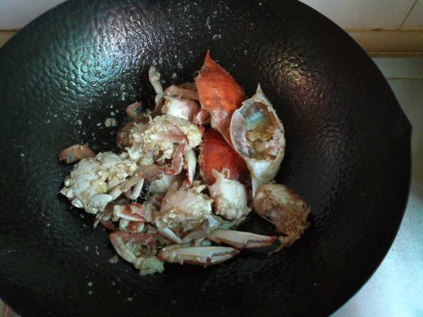 6、小火翻炒一会,使蟹肉逐渐熟透。