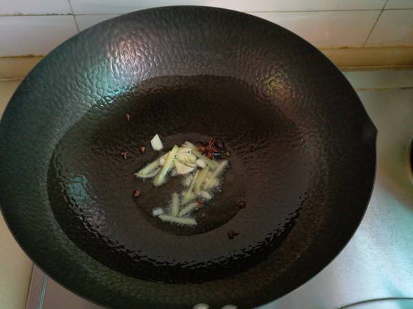 4、炒锅中放入适量调和油,然后放入花椒和八角,再放入姜和大蒜爆出香味。