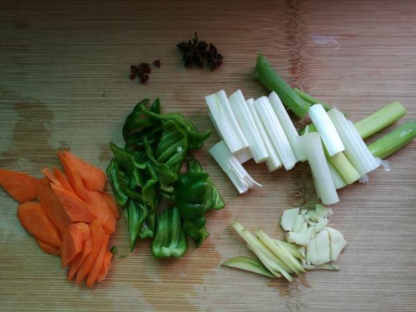 3、将胡萝卜、青椒、大葱、大蒜、姜切好。