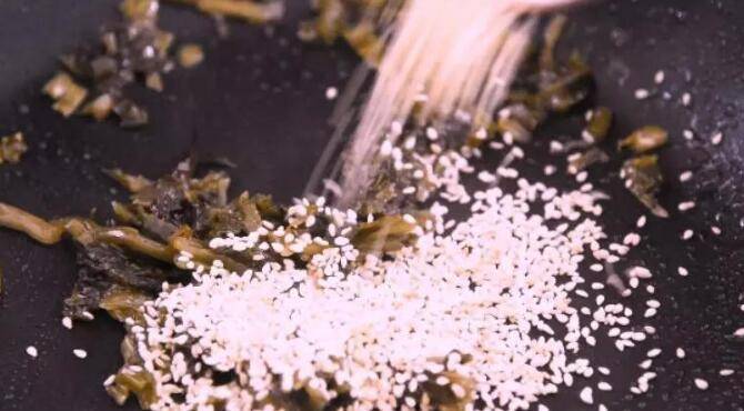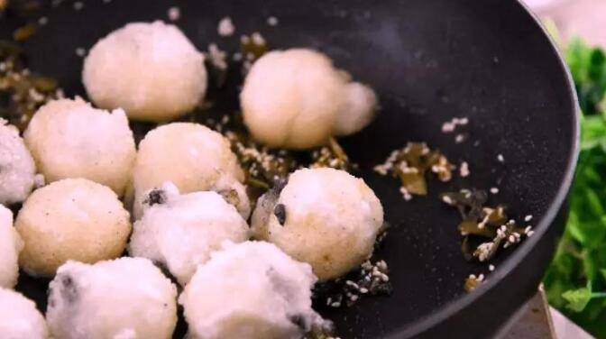 3、再次入锅,关火用余温炸至汤圆浮起,捞出备用。起油锅,倒入雪菜、白芝麻炒香。