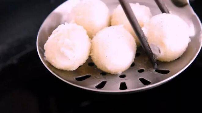 2、六七秒后拿起漏勺,将汤圆拨散。