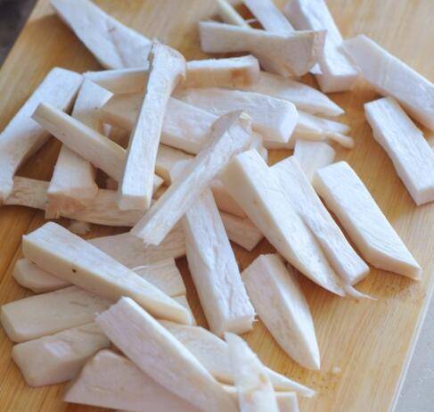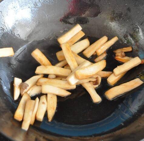 3、锅中倒入油,将杏鲍菇煸软,两面金黄捞出。
