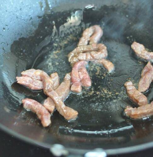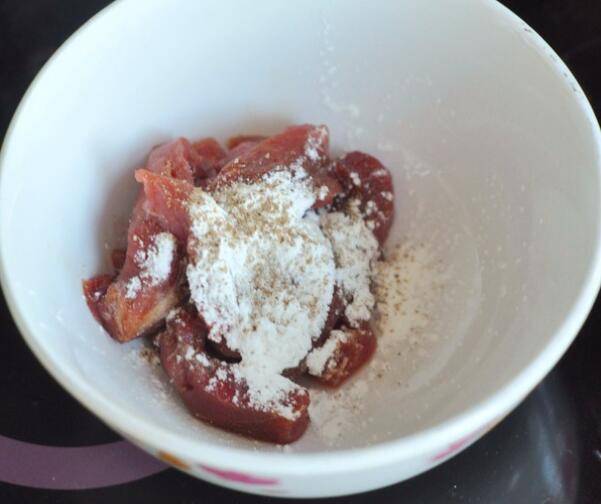 1、牛排肉切成长条状,加入淀粉抓匀。