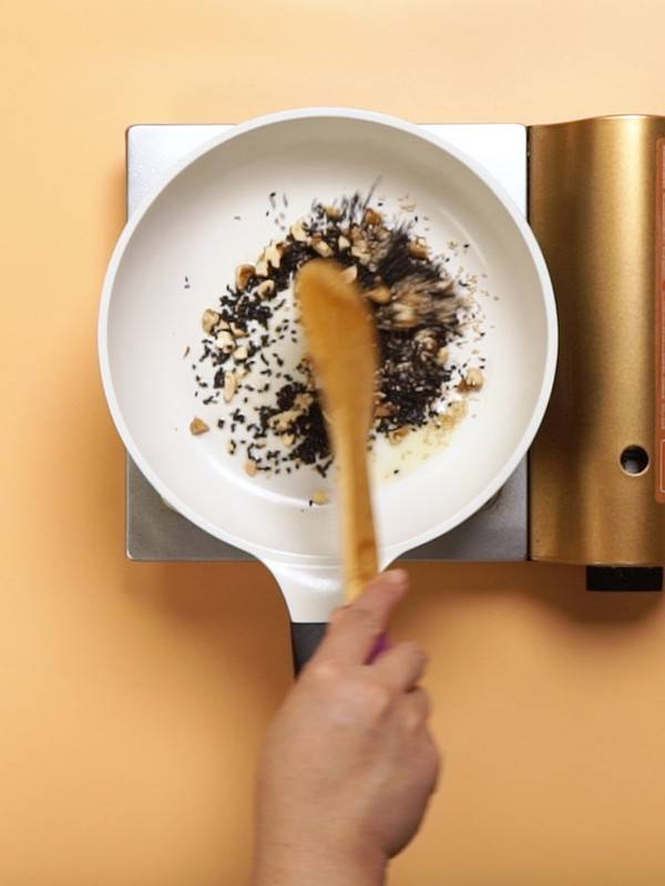 3、锅中倒入食用油、花生、核桃、芝麻、黑芝麻,翻炒均匀。