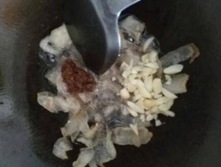 3、下豆瓣酱和蒜末翻炒均匀,加几滴老抽上色,不喜欢老抽也可以不放。