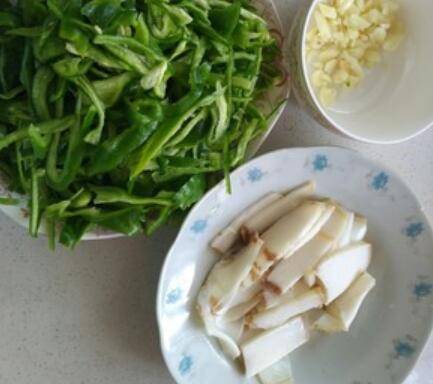 1、准备好材料,青椒去籽切丝,腊肉趁着刚拿出来硬硬的刚好可以切薄片,蒜瓣切末。