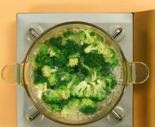 1、清水煮沸,倒入西兰花,焯水30秒捞出。