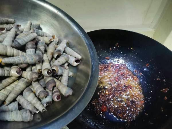 1、准备材料:钉螺500克、麻辣块1小块、辣椒酱1勺、色拉油适量。