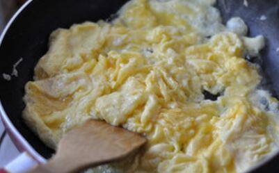 2、锅里倒油,油温烧至7成热,倒入鸡蛋液,小火炒至鸡蛋凝固。