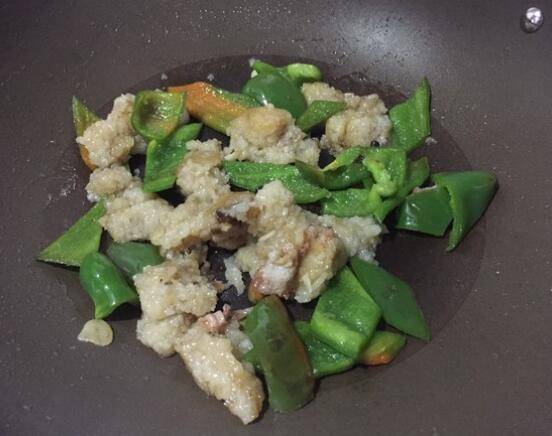 4、把煎好的粽子拨一边,放入切好蒜先爆香一下再放入辣椒进去炒。