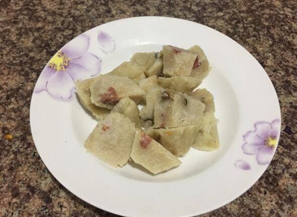 1、将粽子取出来后将粽子叶去除,切成滚刀块装入盘中备用。