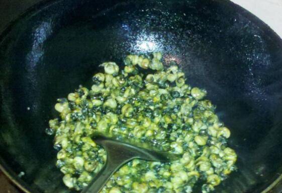 5、锅中放入茶油,将炒干的螺蛳肉放入锅中爆香。