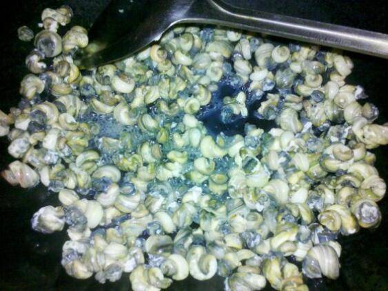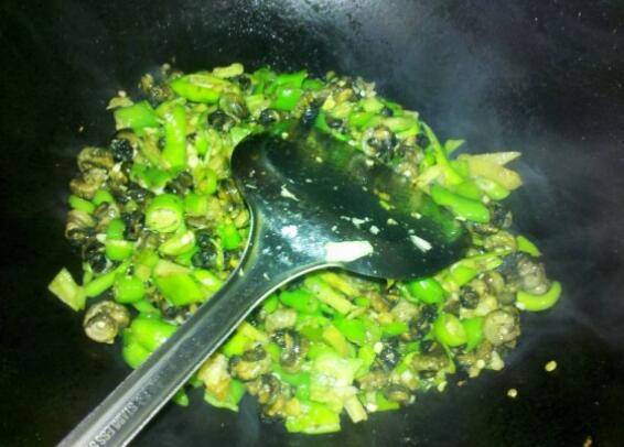 3、锅中烧热后,不需放油,将螺蛳放入锅中炒干水分。