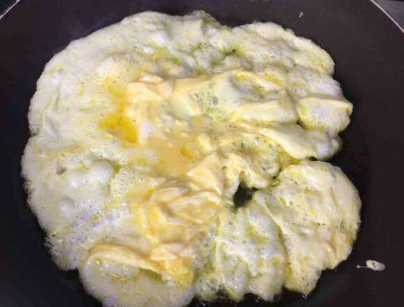 3、锅放油烧热倒入鸡蛋液,煎熟成出备用。
