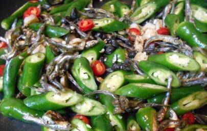 用料:小鱼干50g,青辣椒200g,红辣椒1根,蒜头1个。